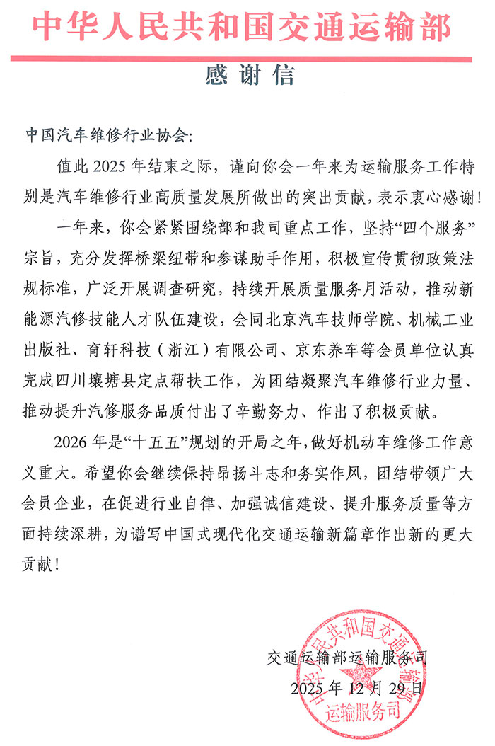 12月29日,交通运输部运输服务司向我会发来感谢信,对协会在过去一年中积极支持该司相关工作,尤其是在推动汽车维修行业高质量发展方面做出的突出贡献给予了高度肯定和诚挚感谢。