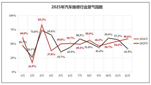 从月度走势看,2025年10—12月汽车维修行业景气指数分别为59.9%、57.3%和41.5%,整体呈现“先升后降”的运行特征。10月份指数环比大幅上升16.5个百分点,反映出行业景气快速回暖;进入11月和12月,指数分别环比下降2.6和15.8个百分点,行业景气明显回落。