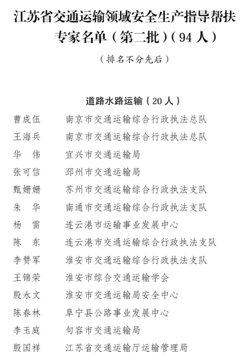 为深入推进交通运输领域安全生产“六化”建设,充分发挥专家在风险管控、隐患排查治理等方面的专业技术支撑作用,1月28日,省交通运输厅公布了第二批江苏省交通运输领域安全生产指导帮扶专家名单,共94名专家入选(具体名单附后)。