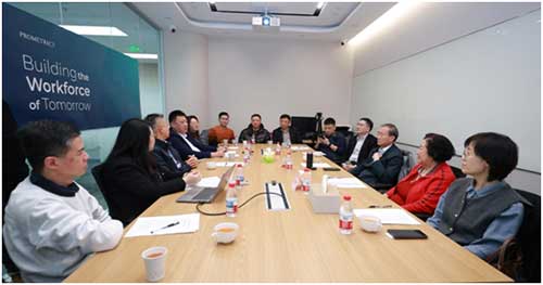 张延华一行观摩了中国首位新能源汽车维修师考生的入场考试过程。冯钢详细介绍了普尔文考试体系的架构、考场流程设计及其在全球范围内的应用情况,强调了该体系在确保考试公平、公正、科学方面的独特优势。