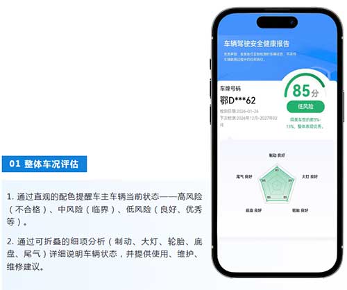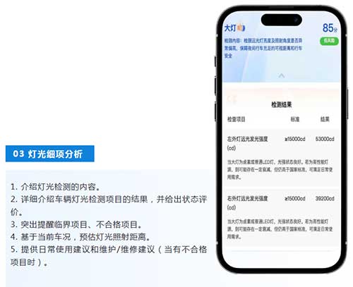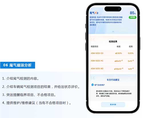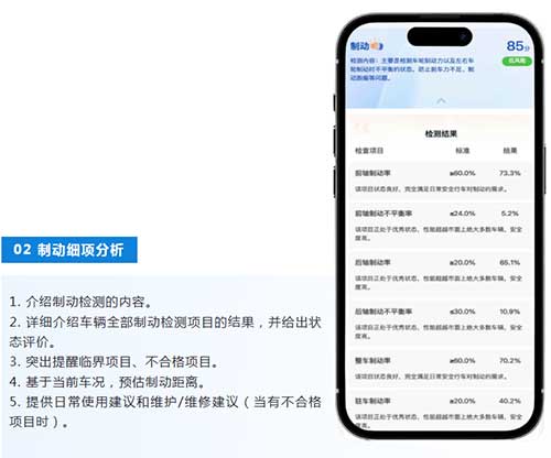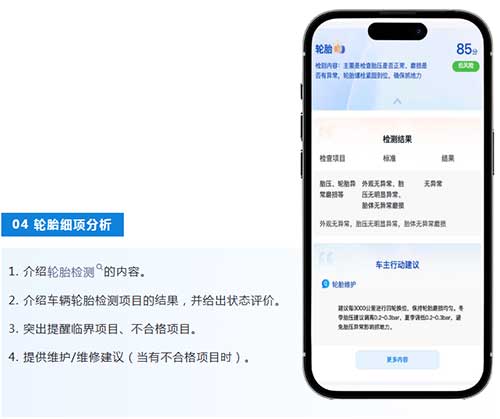 AI智能车况报告不是对检测数据的简单罗列,而是一次基于AI解析的再表达。通过将复杂难解的检测数据和专业术语转换成通俗易懂的语言,让车主获取更多车况信息、降低维修焦虑、知晓检测意义。报告还根据车辆检测结果,提供维保建议和行车安全建议,帮助车主建立对车况的整体认知。