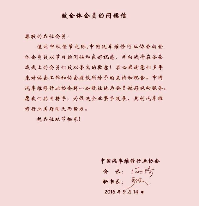 值此中秋佳节之际, 中国汽车维修行业协会陈琦会长、严波秘书长代表协会向全体会员致以节日的问候候和良好祝愿,并向战斗在各条战线上的会员们致以崇高的敬意!慰问信全文如下: