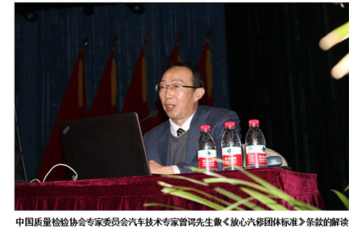 接着,中国汽车维修行业协会连锁工委底彦彬副秘书长做了放心汽修团体标准的编制说明,中国质量检验协会曾谔专家对标准条款进行了解读,放心联合认证中心张海兵总监对标准认证规程进行了说明。