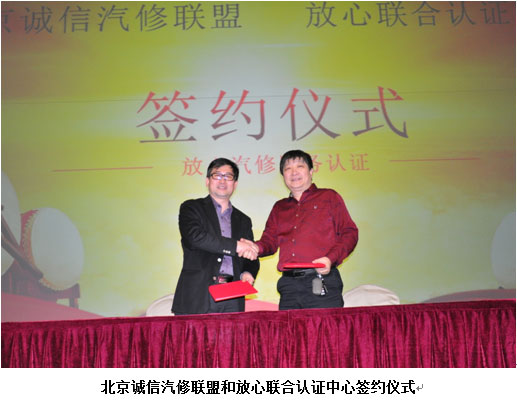 会上,北京诚信汽修联盟和放心联合认证中心还举行了签约仪式,将在联盟成员企业中实施放心汽修标准认证体系。联盟理事长付春智先生介绍了北京诚信汽修联盟的组成和运作情况,希望在联盟内树立放心汽修认证示范企业,推动联盟企业向诚信汽修、绿色汽修方向发展。