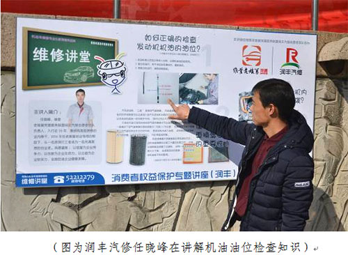 维管老娘舅党建联盟作为常熟维管党支部的党建品牌,不断探索深入企业、联系群众工作新思路,润丰汽修负责人任晓峰作为2016年老娘舅创业导师辅导成功创业的小微企业主,积极向“维管老娘舅”公益服务团队靠拢,准备了展板等材料,并手持发动机舱模板,通俗易懂的向群众讲解了机油油位检查、滤芯更换、预防积碳等常识。群众踊跃提问,主讲人积极回答,群众增长了汽修消费知识,企业也了解了消费者的真实想法。虞城修车好青年诚信经营签约活动则真诚倡导了诚信、尊重、规范、品牌、质量、公平、文明、绿色等经营理念,受到了现场维修企业的积极支持。